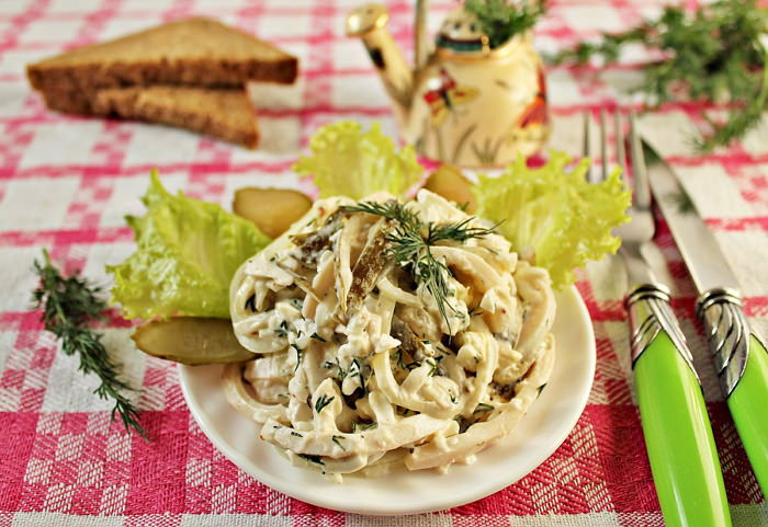 Салат с кальмаром и солеными огурчиками