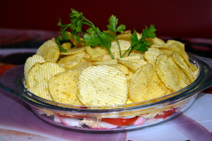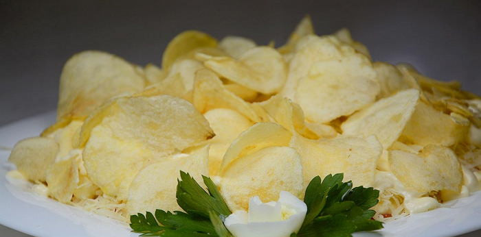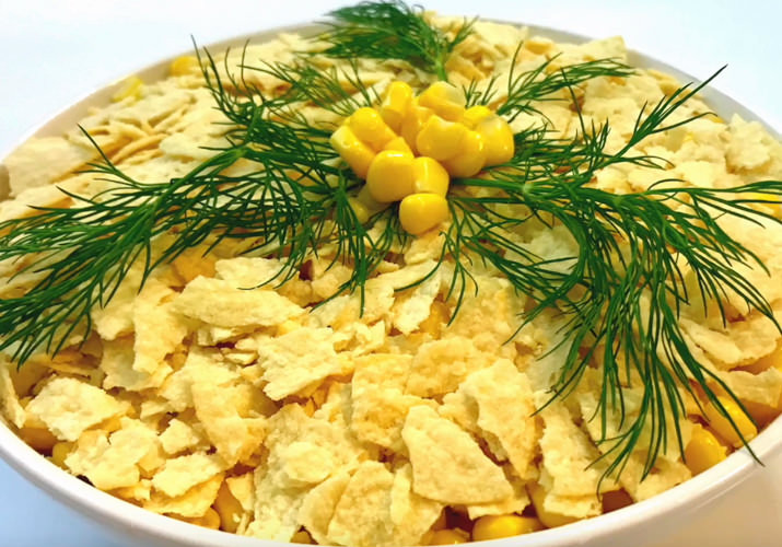 - Украшайте салат чипсами непосредственно перед подачей. Иначе они размякнут.