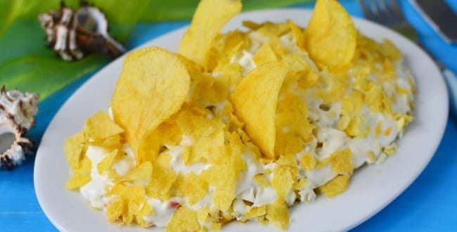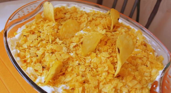 - Несколько чипсов вставить в салат. Остальные — разложить по поверхности целыми или поломанными.