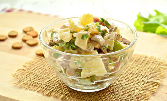 Салат с курицей, ананасами и грибами — прекрасный вариант разнообразить своё ежедневное меню. Блюда с такими ингредиентами обладают пикантным вкусом и хорошо усваиваются организмом. Вариаций этой закуски множество, при этом в качестве компонентов используют копчёное мясо, консервированный или свежий ананас, шампиньоны, вешенки или опята. Ниже можете ознакомиться с подборкой лучших рецептов.Салат с ананасами, грибами и сыром.
