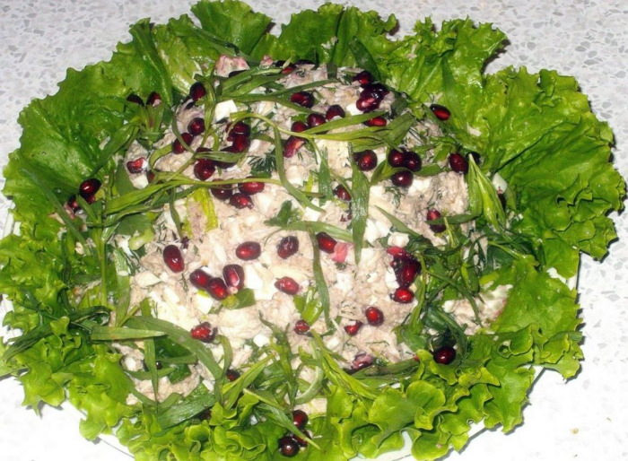 - Выкладываем капусту на плоскую тарелку. На нее кладем мясо, далее ананас, прожаренные грибы, зернышки граната, измельченные сельдерей и яйца. Майонез и специи – кладем по вкусу.