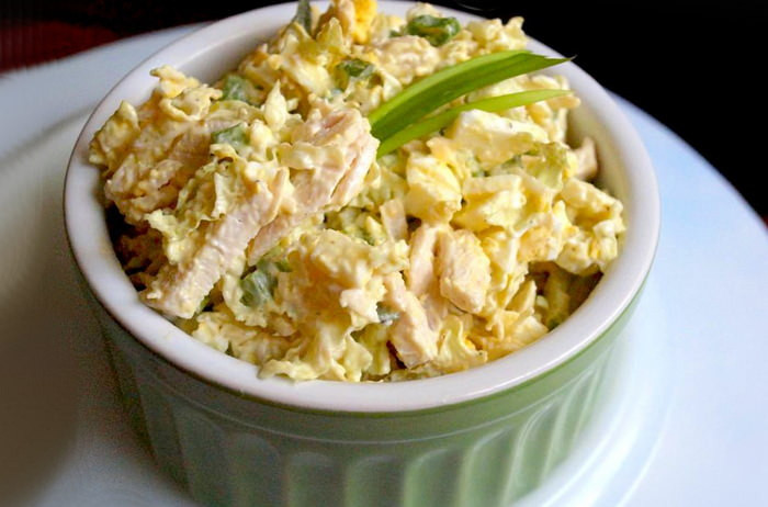 - Заранее отварить куриную грудку дать ей полностью остыть. Затем, крошим небольшими кубиками холодное куриное мясо.