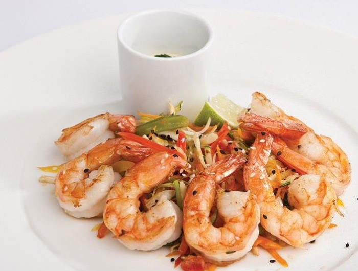 - В мисочке сделать соус заправку. Для этого в оливковое масло влить бальзамический уксус, сок лимона и добавить горчицу. Все тщательно размешать. При желании можно добавить перец и соль. Готовый соус ложкой выложить в нескольких местах. Вкусный салат с жареными креветками можно подавать к столу.