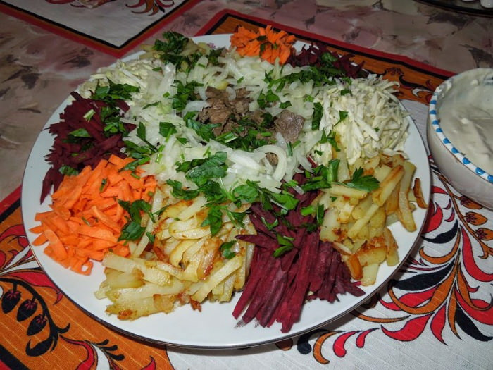 - В состав салата чафан обязательно входят сырые морковь и свекла, маринованный лук. Дополнительно в рецептуру могут быть включены белокочанная капуста, обжаренный картофель, один из видов мяса, зелень и даже сыр.