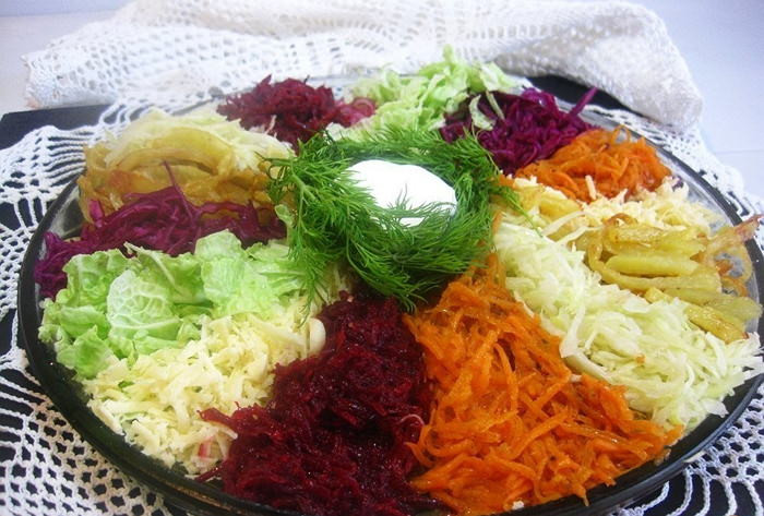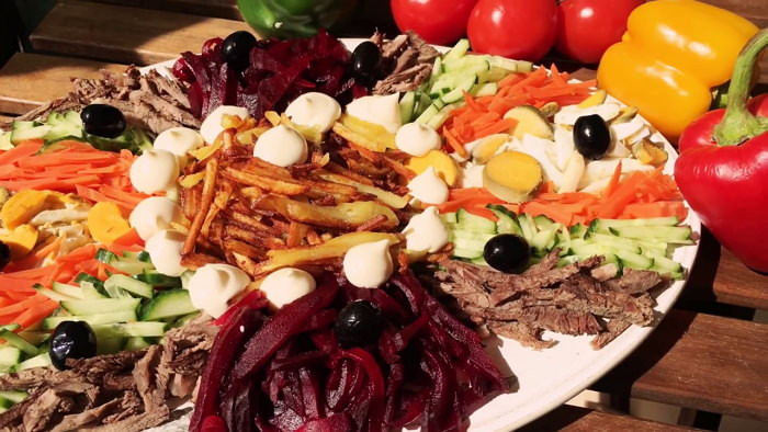 - Взять блюдо. В центр уложить горкой мясо, а вокруг аналогично остальные овощи. В каждую горку капнуть немного масла и присолить салат сверху. Перемешать на столе перед подачей.