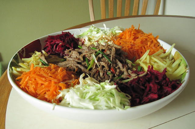 - Далее нарезаем и натираем все необходимые продукты. Свёкла и морковь используются в салате в сыром виде. Их надо нарезать тонкой соломкой или натереть на тёрке для корейской моркови. Капусту нашинкуйте и помните руками. Говядину нарежьте против волокон тонкими полосочками.