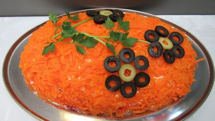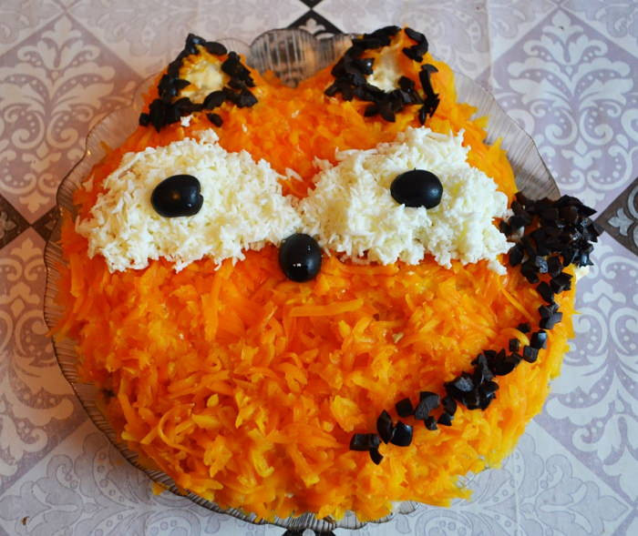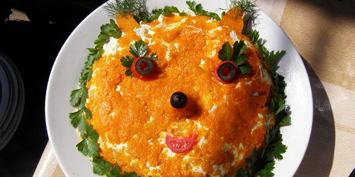 - Чтобы салат имел красивый и праздничный вид, рекомендуется верхним слоем всегда оставлять тёртую морковь, а затем украсить поверхность блюда на своё усмотрение. В оригинале, этот салат должен иметь форму лисицы.