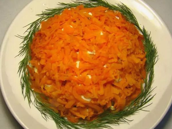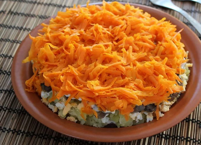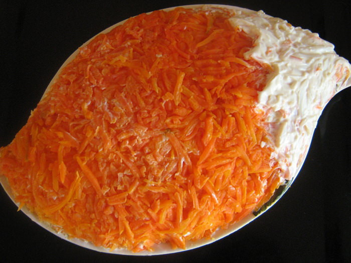- Выложите тертую морковь. Придайте салату вид ровной полусферы. Края тарелки протрите салфеткой от майонеза.