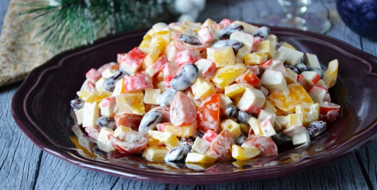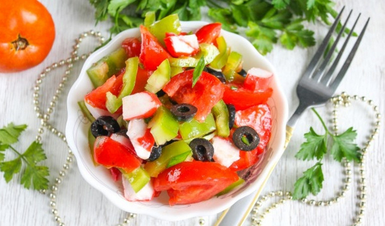 Салат с крабовыми палочками, помидорами и маслинами без майонеза