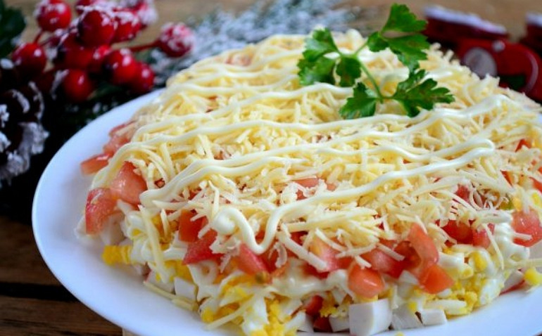 Рецепт слоеного салата с помидорами и крабовыми палочками