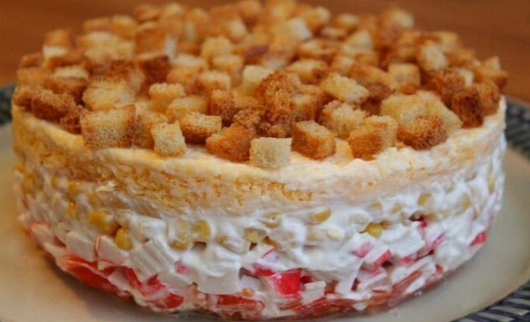 Особенно большое разнообразие получили салаты с крабовыми палочками и кукурузой. Удачных сочетаний много, одно из них – с помидорами и сыром. На вкус такая закуска получается очень нежной и сочной. А хрустящие сухарики выгодно подчеркивают деликатность салата и отлично вписываются в общую картину.Ингредиенты: