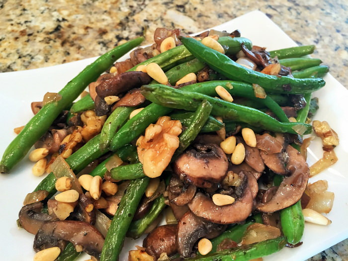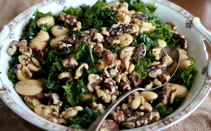 - Влить заправку в салат, перемешать и посыпать мелко нарезанной зеленью. Салат с фасолью, грибами и грецкими орехами можно подавать к столу.