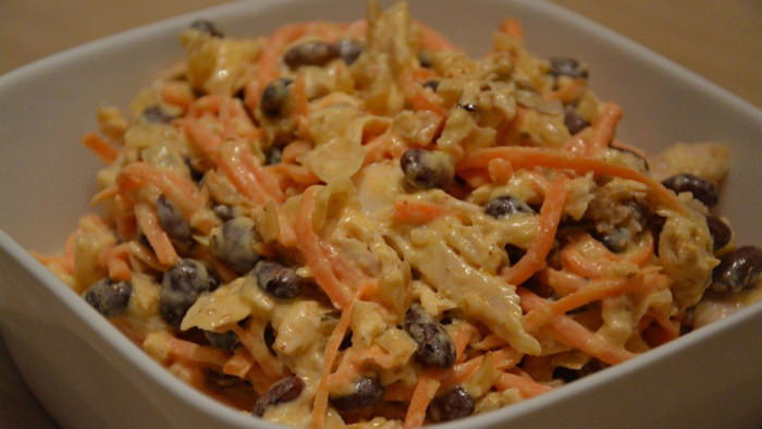 - Приправляем майонезом перед самой подачей. По желанию добавляем соль/перец, но сначала обязательно пробуем — курица уже соленая, а морковь, как правило, достаточно острая. Излишняя резкость и острота салату не нужны. Салат с курицей и морковью а так же фасолью можно подавать на стол.