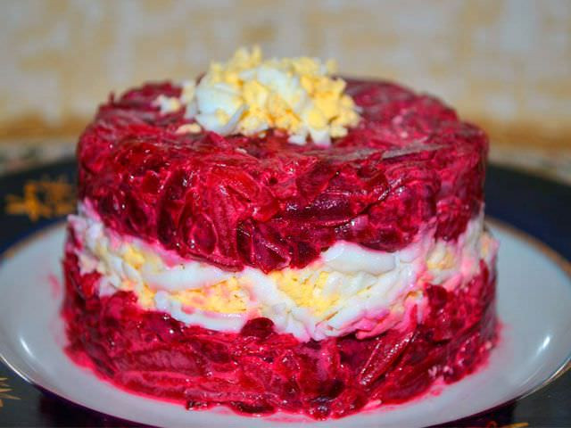 - Далее снова идет слой майонеза, поверх которого выкладывается слой тертой свеклы — количество майонеза можно уменьшить по вкусу. Аккуратно снимите кольцо или выровняйте салат ложечкой.