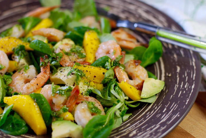 - Добавьте обжаренные королевские креветки, еще раз перемешайте салат, подавайте на стол.