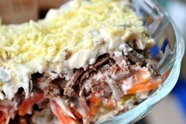 1 слой – отварная печень, натертая на крупной терке. 2 слой – огурчики на крупной терке. 3 слой – морковь на крупной терке обжаренная с луком, (желательно растительного масла добавить только чуть-чуть, чтоб морковь не была слишком жирной) посыпать слой чесноком через пресс. 4слой – яйца натереть на мелкой терке. 5 слой – посыпать сыром.