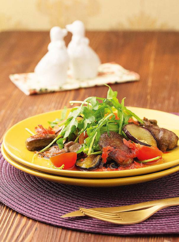 Разрезать помидоры пополам. Промыть печеночку, просушить, удалить пленки, протоки, посолить. Обжаривать на разогретой сковороде с оливковым масличком до золотистости, снять с огня, доводить до готовности в духовом шкафу в течение 4–5 мин при 180 °С. Измельчить маринованный имбирь. Смешать отдельно в емкости мед с оливковым маслом и имбирем. Выложить в емкость баклажаны, помидоры, печенку, рукколу, добавить заправку. Перемешать салатик и подать.