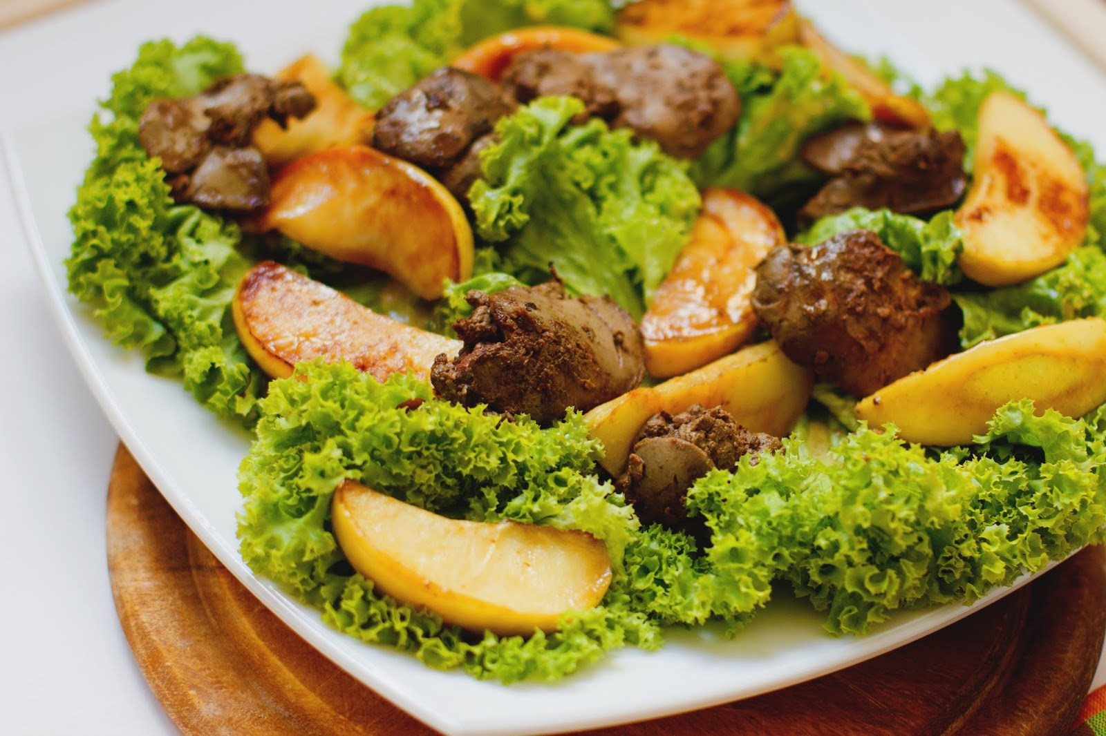 - На тарелки разложите листья салата, яблоки, лук, печень. Полейте заправкой.
