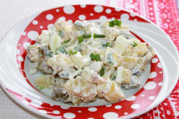 - Соленые огурцы нарезать кубиками. Смешиваем чайную ложку горчицы и две столовые ложки майонеза и заправляем салат.