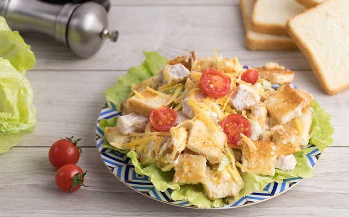 - Адыгейский сыр порезать кубиками. Листья салата порвать руками на небольшие кусочки.