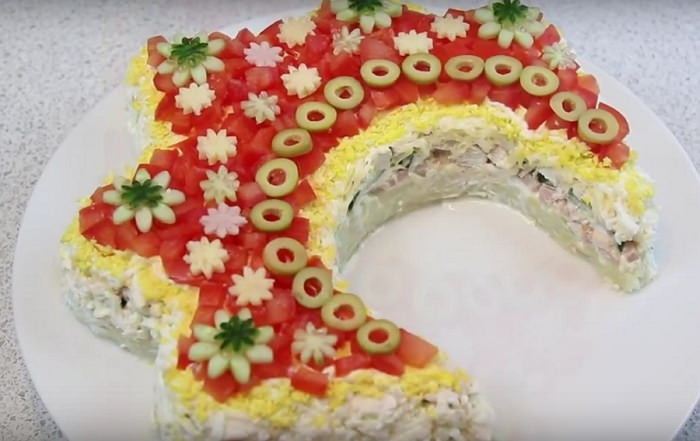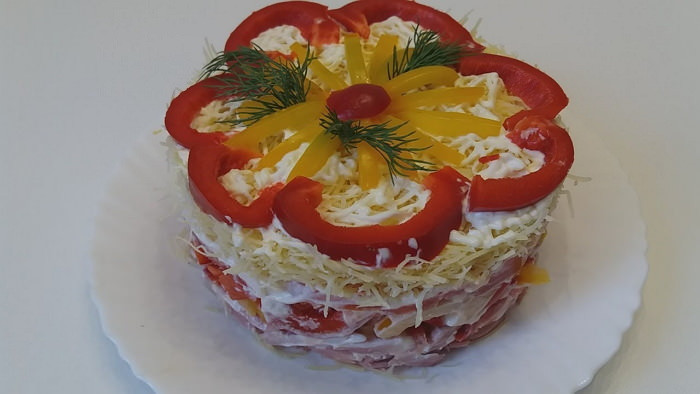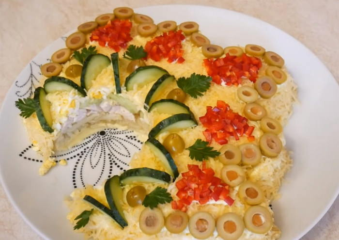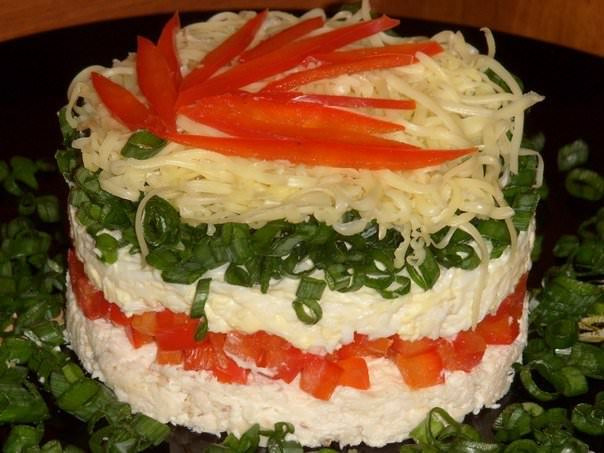 - Затем ещё раз повторить все слои, можно добавить еще и сыр. Убираем чашку. Верх салата украшаем яркими полосками болгарского перца и маслинами вместе с нарезанной зеленью.