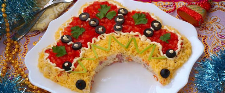 - выкладывать продукты в форме кокошника или короны имеет смысл только на праздничное застолье — для обычного ужина легче сделать простой слоеный салатик, украсить его зеленью.