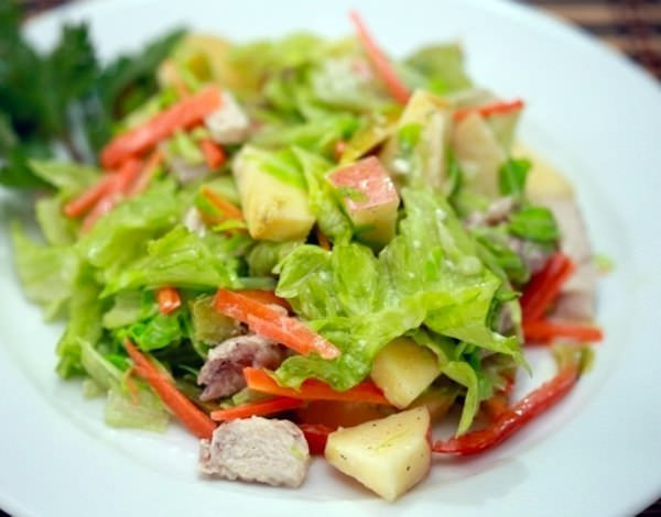 - Яблоко промыть под холодной водой, после нарезать кусочками. Листья салата порвать и смешать все ингредиенты. Посолить и поперчить по вкусу, заправить оливковым маслом, перемешать и подавать.