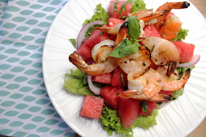 Такой салат из креветок и рукколы подается на ломтиках арбуза.Ингредиенты: