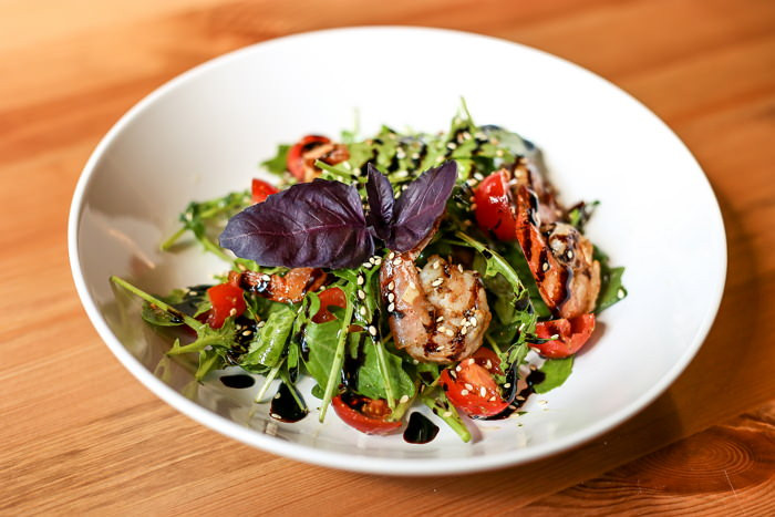- На тарелку выложить рукколу, затем помидорки с авокадо. Посолить, поперчить. И сверху выложить креветки. Сбрызнуть все лимонным соком и бальзамическим уксусом. Оливковое масло добавлять по необходимости.