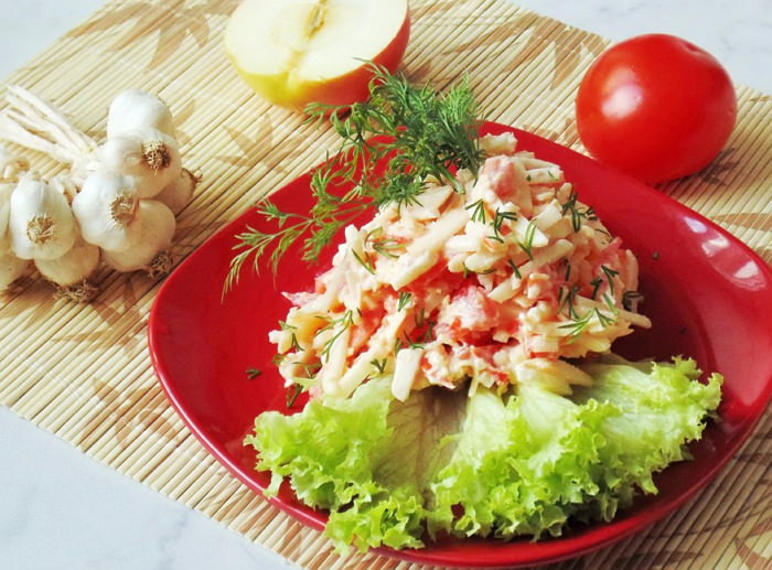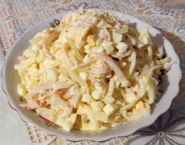 - Все ингредиенты смешайте в глубокой салатнице, добавьте кукурузу. Заправьте блюдо майонезом. Такой салат сразу подавайте к столу.