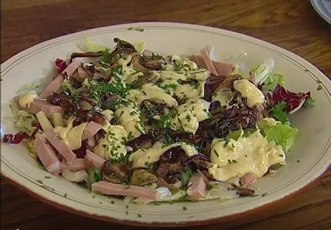 - Буженину нарезать кусочками и выложить на салат. Приготовить заправку: соединить горчицу, сливки, оставшееся оливковое масло и уксус, посолить, поперчить и перемешать.