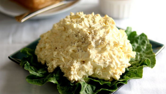 - Яйца отварить в чуть подсоленной воде до готовности, после их следует остудить. Почистить и натереть на крупной терке отваренные яйца.