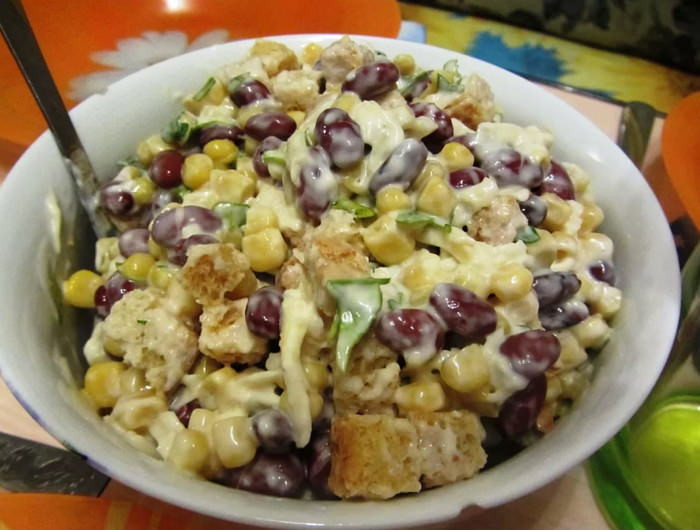 - В салатнике смешать куриное филе, фасоль, сыр, кукурузу, маринованные огурцы, петрушку и чесночные сухарики из чёрного хлеба, добавить майонез, салат ещё раз перемешать.