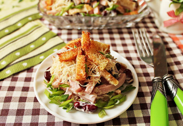 Салат с фасолью, ветчиной и сухариками