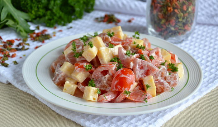 - Измельчаем два небольших зубчика чеснока, добавляем в салат. Кто не любит этот овощ – не кладите. Заправляем салат майонезом. Много класть не нужно, помидоры пустят сок и влаги в салате будет достаточно.
