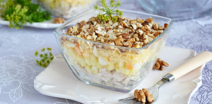 Салат с курицей, ананасом и орехами