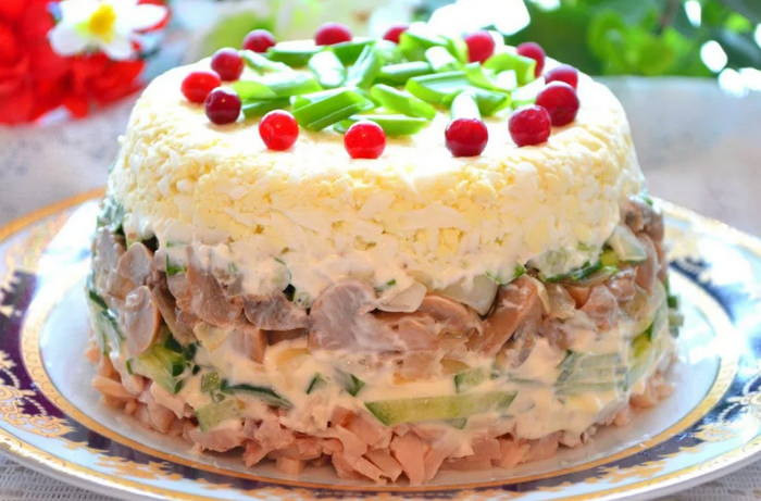 Салат Ирина с копченой курицей и грибами