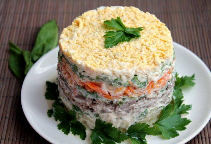 - Майонез смешайте с давленым чесноком. Теперь нужно выложить салат на тарелку для подачи слоями. Начните со слоя мяса, а далее выкладывайте в такой последовательности: майонез, маринованный лук, морковь, майонез, яйцо, сыр, майонез. Верхний слой смажьте тонким слоем майонеза и украсьте тёртым яичным желтком.