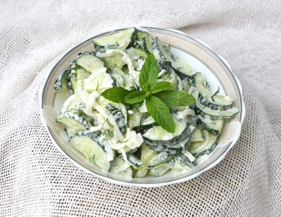 Огуречный салат с копченой курицей и мятой