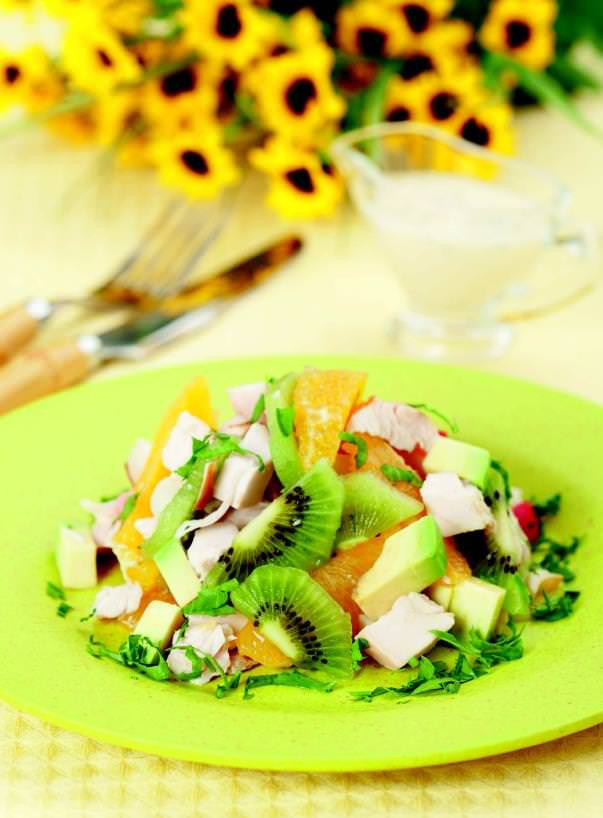 Куриный салат с личи, апельсинами, киви и авокадо
