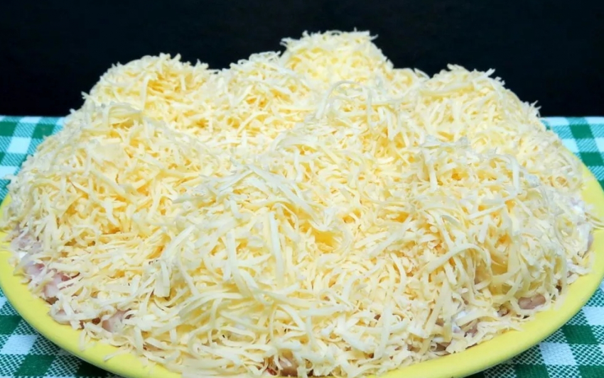 - Сыр, желательно выбрать наиболее светлый, натереть на средней терке. Обильно посыпать салат сыром. Отправить в холодильник на некоторое время, чтобы дать как следует пропитаться.