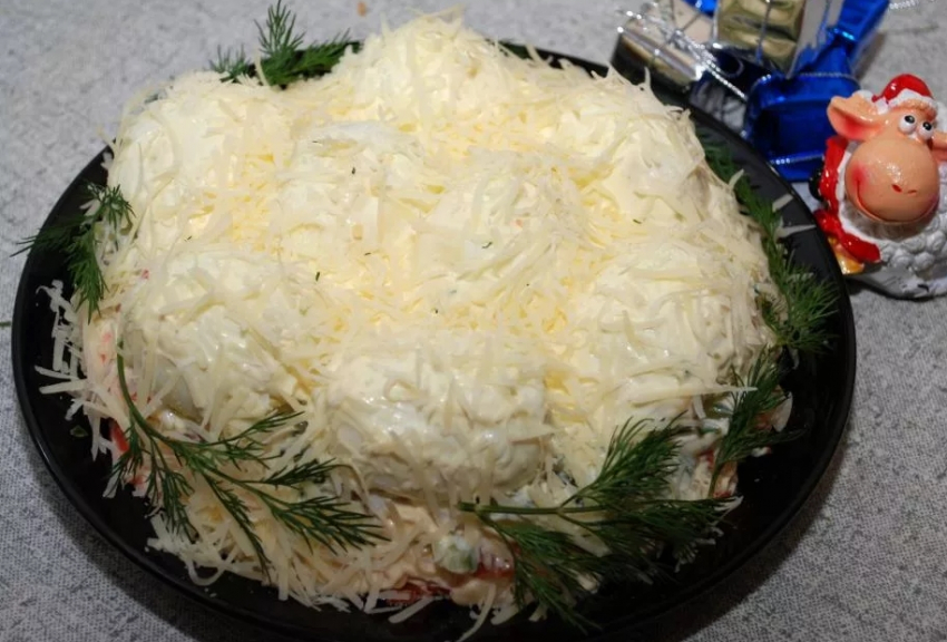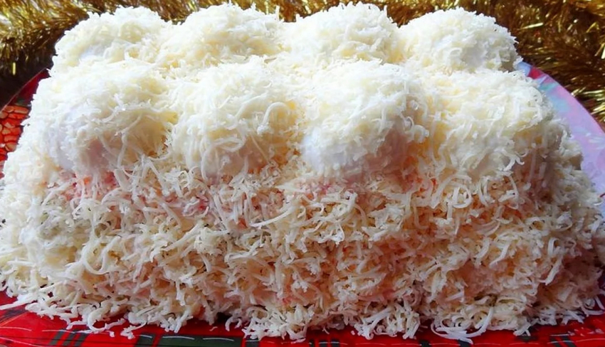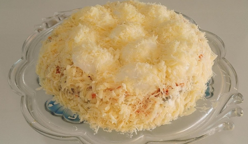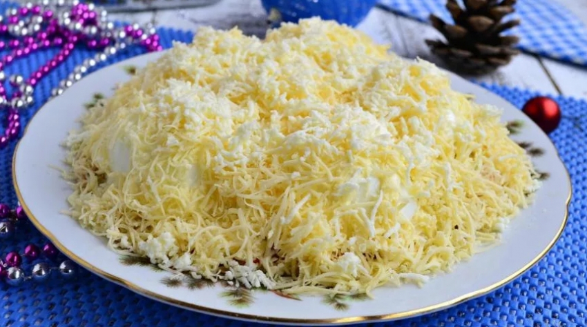 - На мелкой тёрке натереть твёрдый сыр и тщательно посыпать салат сверху. Салату дать немного пропитаться и подавать к столу. Салат «снежный сугроб» готов к подаче. Приятного аппетита!
