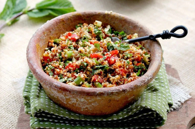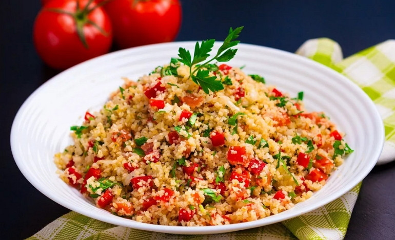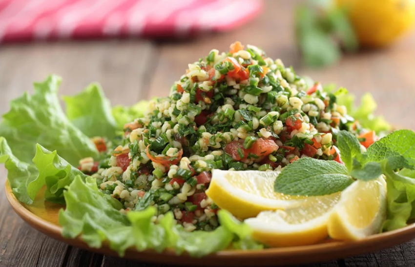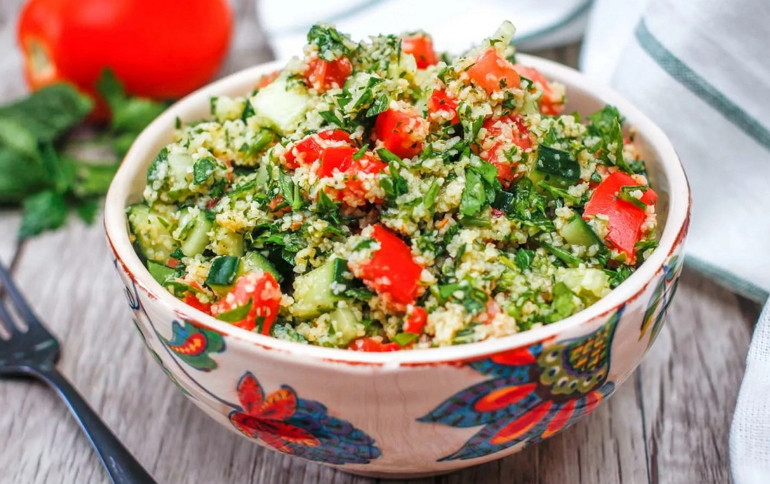 Этот вкусный свежий салат может подаваться как гарнир, например, к мясу, или как самостоятельное блюдо. Основными составляющими салата являются булгур (можно заменить кус-кусом), большое количество петрушки и мяты.