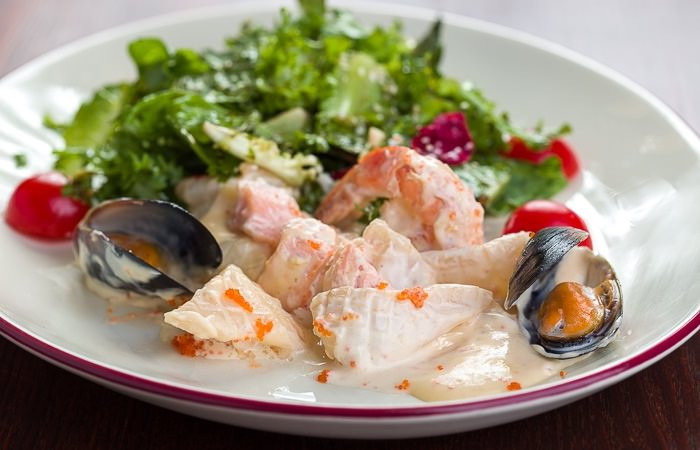 - 5) Сверху выложить теплые морепродукты, кружочки огурца, полить заправкой, сверху выложить стейк из семги (рыбу можно разломать вилкой и выложить кусочками).