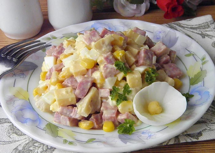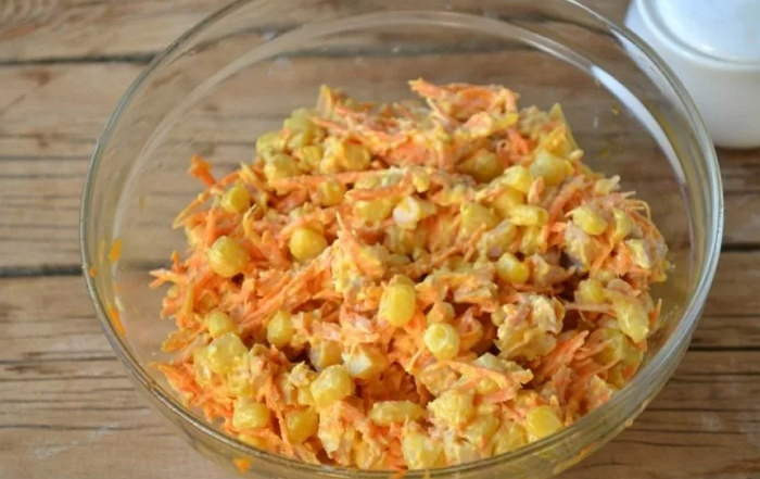 - Добавляем майонез и хорошо перемешиваем, можно добавить для сочности 2ст.л. рассола от кукурузы. Этот салат можно сразу подавать на стол.