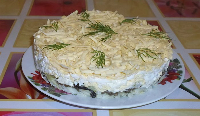 Это блюдо невероятно сытное, поэтому его можно употреблять отдельно от других блюд. Во внешнем виде этот салат также не уступает другим и будет украшать собой любое праздничное застолье.Ингредиенты: