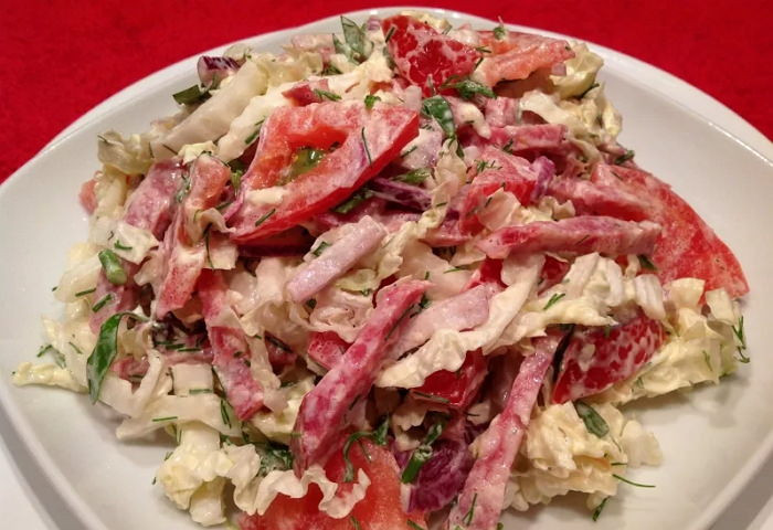 Салат питательный, обладает неизбитым оригинальным вкусовым сочетанием.Ингредиенты: