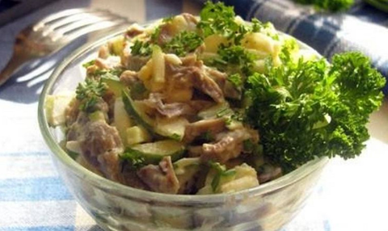 Сытный салат из куриных желудков с огурцом