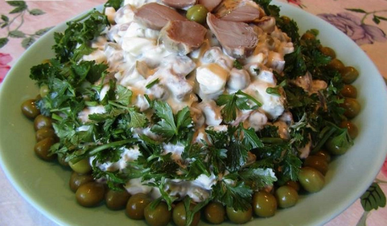 Освежающий салат с желудками и горошком