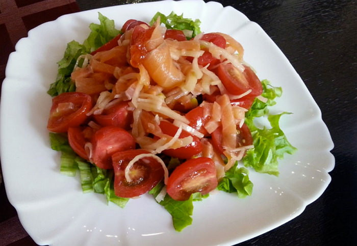 - Рыбу, лук без маринада и томаты солят, перемешивают и кладут на салат.